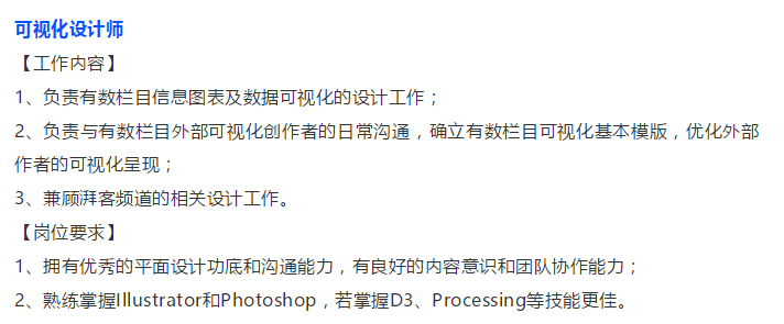 比如“澎湃新闻”招聘的“数据与可视化设计师”,其职责是与编辑、记者一起参与数据新闻的策划,最终完成数据新闻的可视化和大型互动产品的开发。
