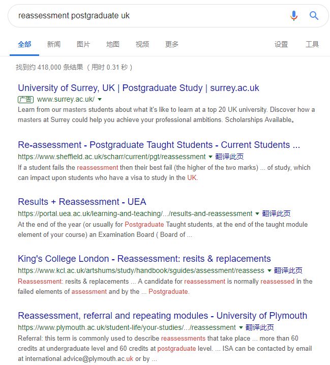 一般你登入搜索网站,在搜索栏中输入“Reassessment postgraduate”或者“Resit an exam” + “输入你所在的学校”。就可以查询到你所在学校关于补考的措施。
