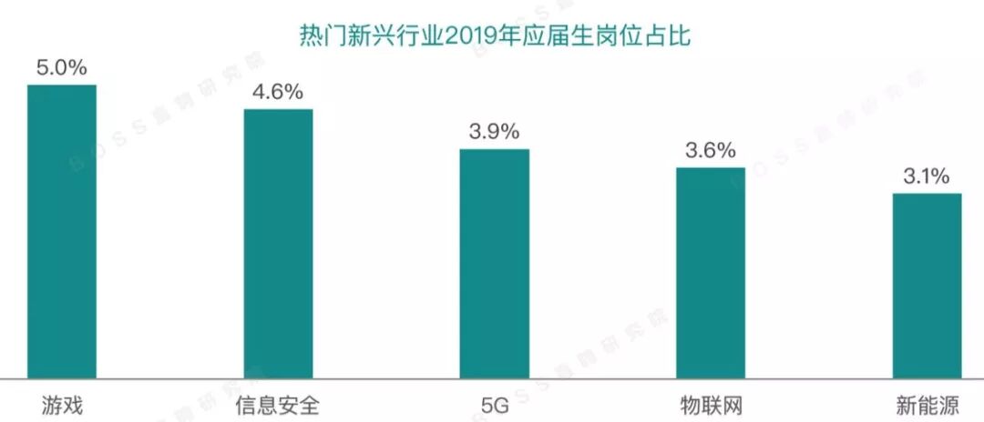 从新兴的就业方向来看,如今的电竞、5G工程师、物联网工程师等几个热门领域对应届生较为友好,新兴行业发展机会充足。并且向应届生开放的岗位占比普遍高于全行业均值。