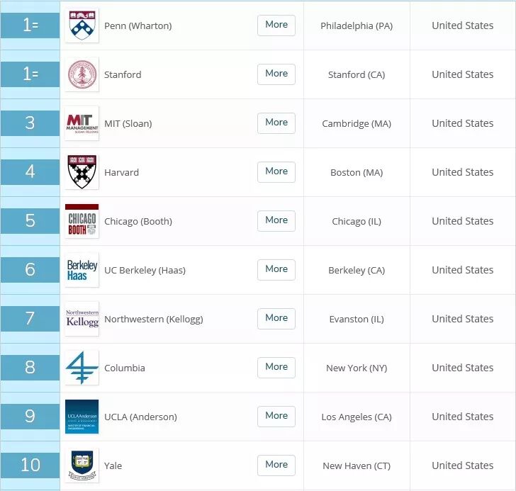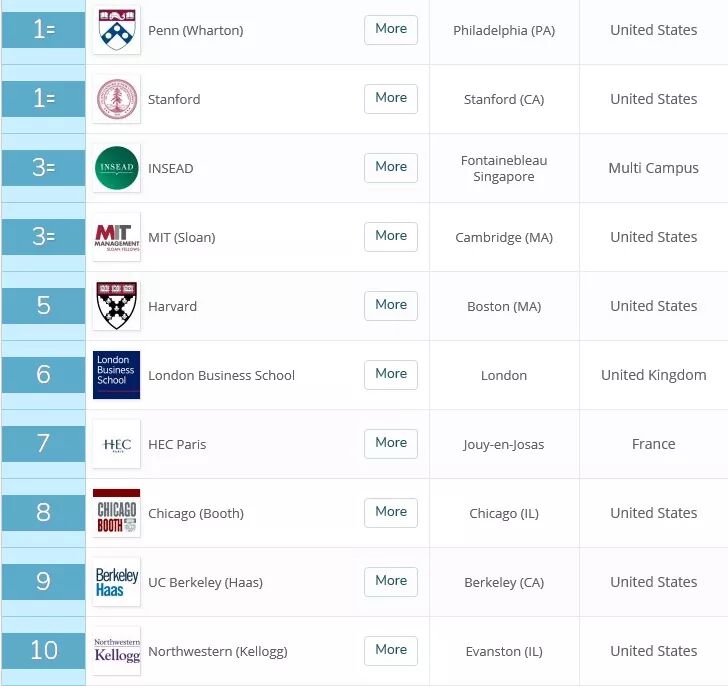 2020 QS全球MBA美国前十的院校: