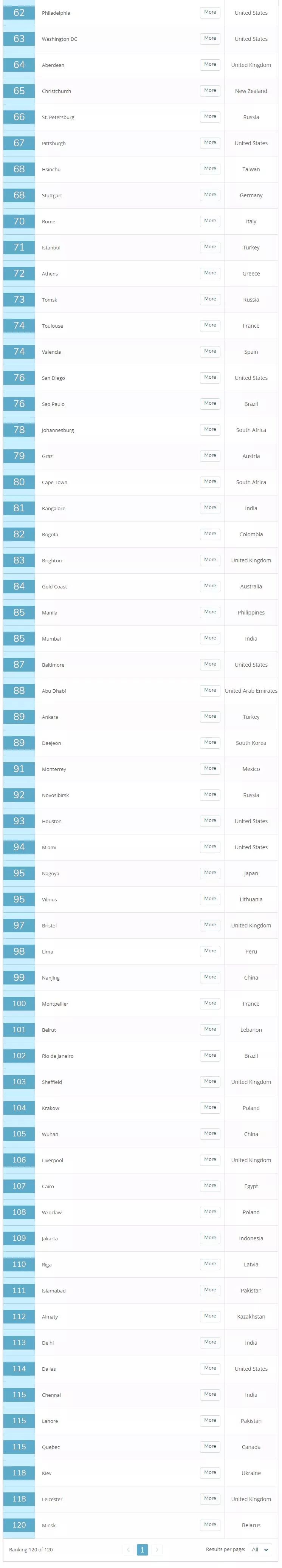 中国区中,香港排名最高位列第14,台北排名第17 。除此之外,北京和上海分别位列第32位和33位。南京也进入百强,位列第99位,武汉排名105名。