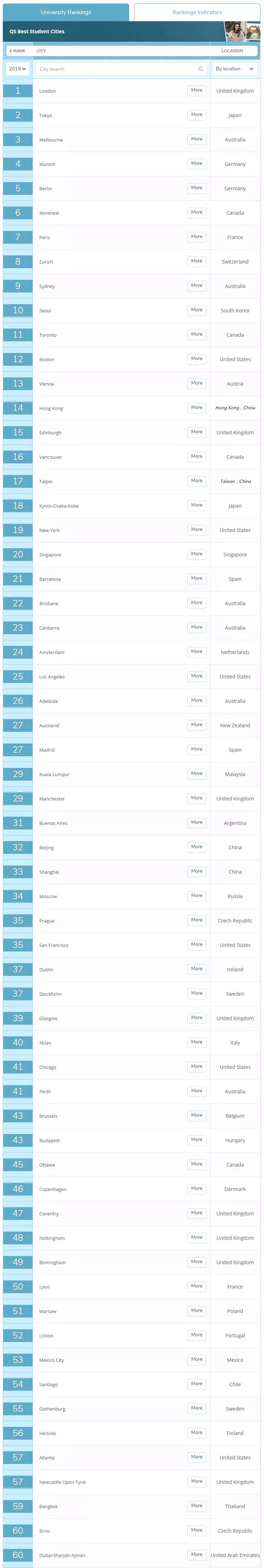 这也是本排名最重要的指标,在该城市学习的学生怎么看待这个城市?QS从87000个学生调查问卷中得出了学生反馈数据。