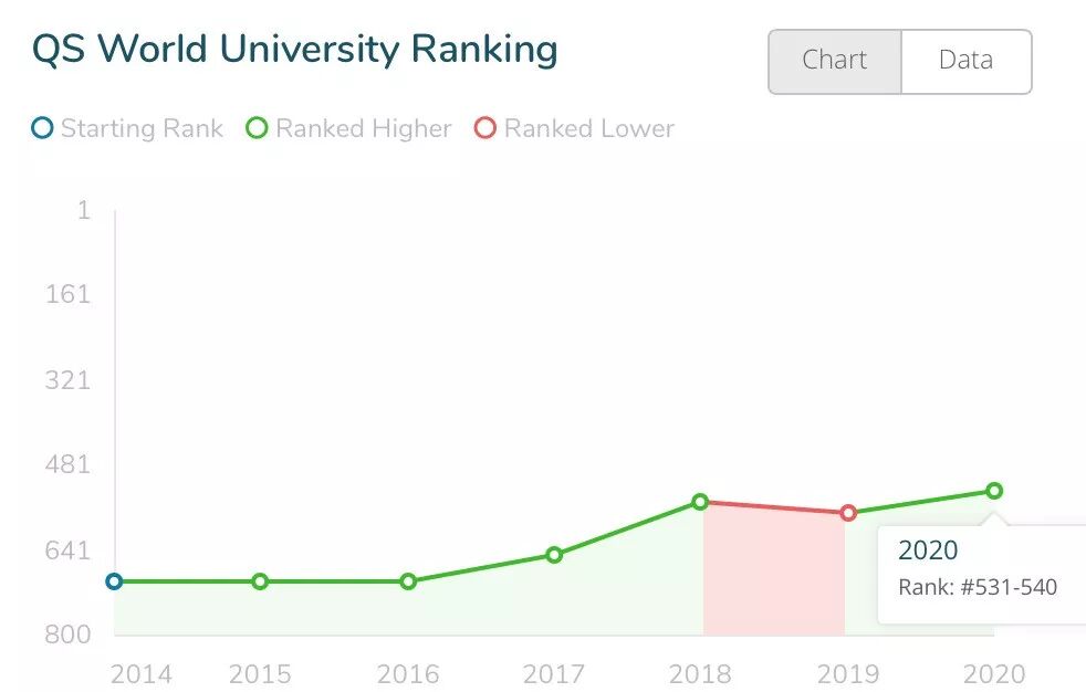 在2020QS世界大学排名位居全球第521-533名,并且是一直呈上升趋势。