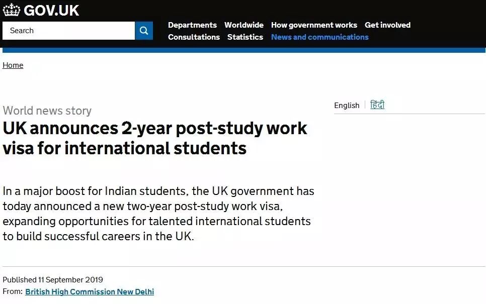2019年9月,英国政府官网发布重磅消息,将恢复深受国际留学生欢迎的PSW(PostStudy Work)签证,允许留学生在毕业后继续留在英国长达两年时间,从而有更充足的时间和精力去寻找海外的工作机会。该政策对于2020年入学的英国本科和硕士留学生有效,他们将在毕业后获得2年PSW签证。