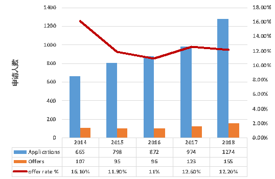 丨(图1)2014-2018年牛津大学中国学生申请及预录取数量(数据来自http://www.ox.ac.uk)