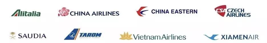 俄罗斯航空SU、阿根廷航空AR、墨西哥航空AM、欧罗巴航空UX、法国航空AF、意大利航空AZ、中华航空CI、东方航空MU、捷克航空OK、达美航空DL、印尼鹰航GA、肯尼亚航空KQ、荷兰皇家航空KL、大韩航空KE、黎巴嫩中东航空ME、沙特航空SV、罗马尼亚航空RO、越南航空VN、厦门航空MF。