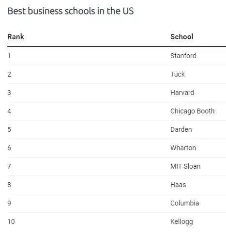 在今年的排名中,斯坦福大学稳居第一,达特茅斯大学商学院和哈佛商学院分获二三位。