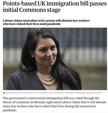 5月18日,英国下议院进行了脱欧时代的新移民法二读程序,在二读最后,该移民法以351:252的票数二读通过,这也就意味着英国即将开始实施积分制移民的政策。