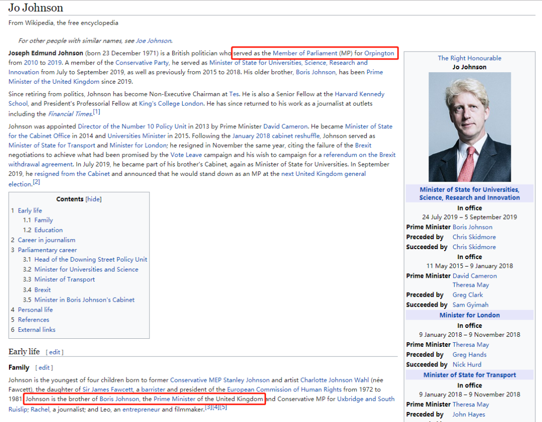 从Jo Johnson的履历来看,他此前是Orpington地区的议员,家族中目前最著名的是他的哥哥,现任英国首相鲍里斯.约翰逊。