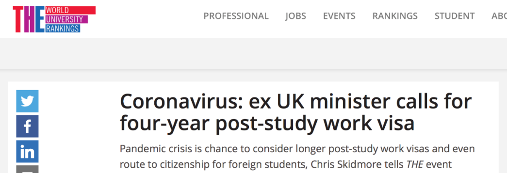 英国的另一位前大学部长乔·约翰逊(Jo Johnson)(现任首相约翰逊的弟弟)表示,期待新冠疫情危机将促进 “强化一种相对较新的共识,即国际学生为英国大学和整个英国经济做出了贡献”。