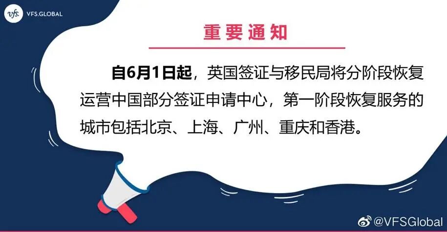 早在两周前,英国签证与移民局(UKVI)就宣布,将中国大陆地区的北京、上海、广州、重庆四地的签证中心放在重启服务的第一阶段,于6月1日开始恢复运营。