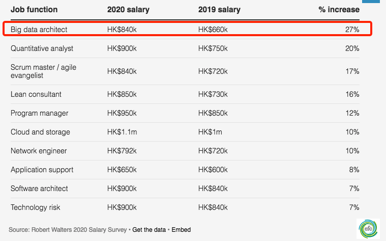 Robert Walters的最新数据表明,香港所有银行科技相关的职位平均薪酬较一年前增加了5%以上。而最显眼的数据是,大数据架构师的薪酬增长了27%!