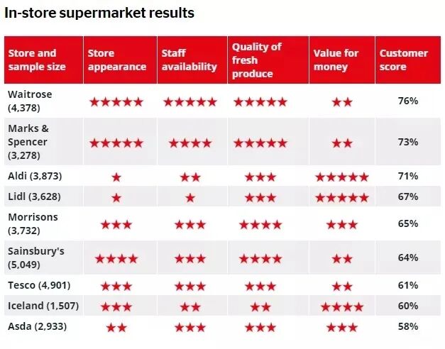 在2020年Which?网站评选的英国超市排行榜里,Waitrose依然稳居第一,凭借良好的购物环境、员工服务态度和商品质量拿到了76分的客户满意度高分。