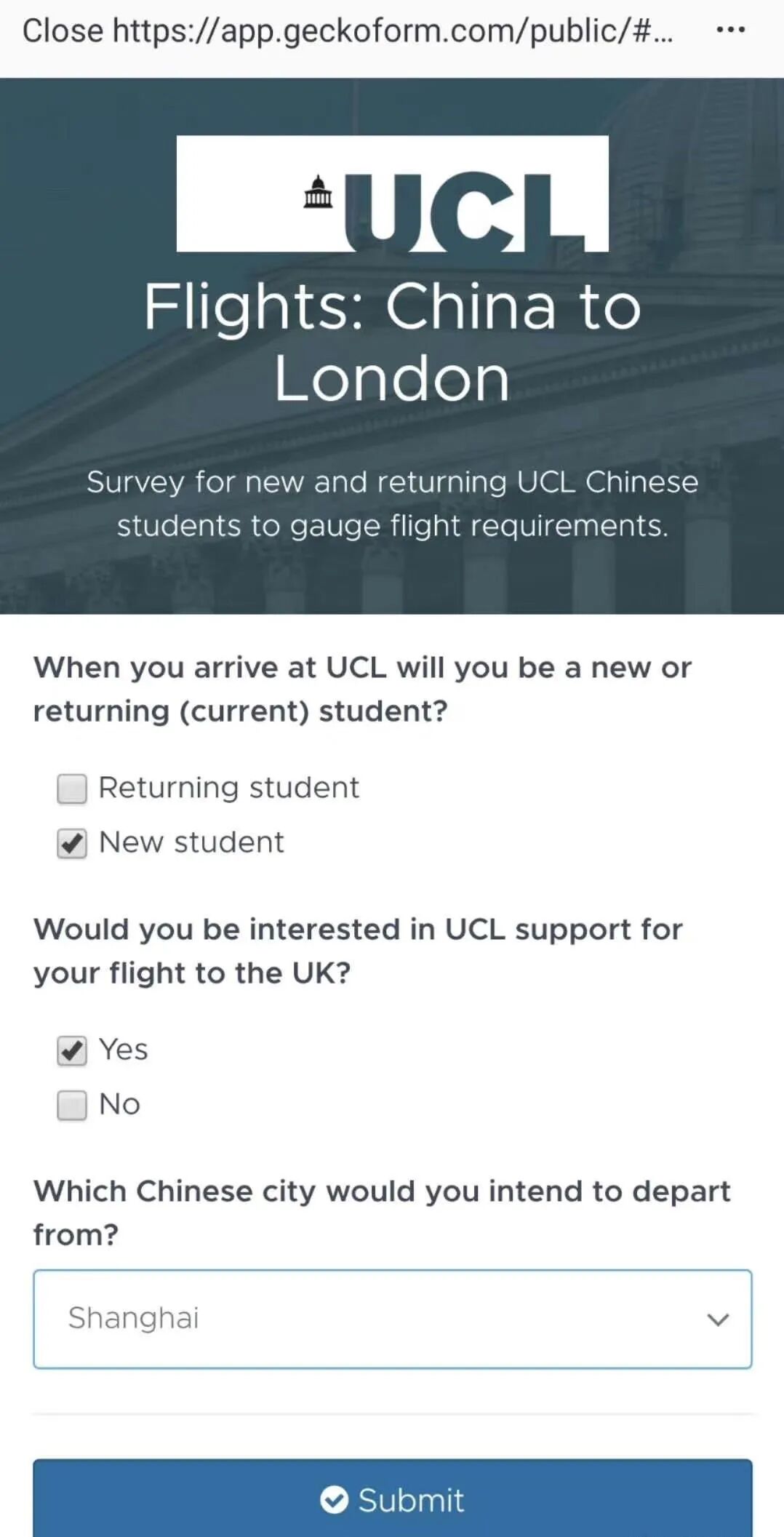 部分同学已经收到UCL发来的包机意向调查问卷 ▲