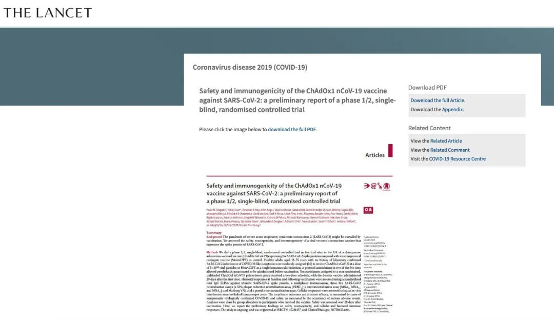 牛津大学疫苗临床I/II期结果于7月20日公布发表于《柳叶刀》期刊