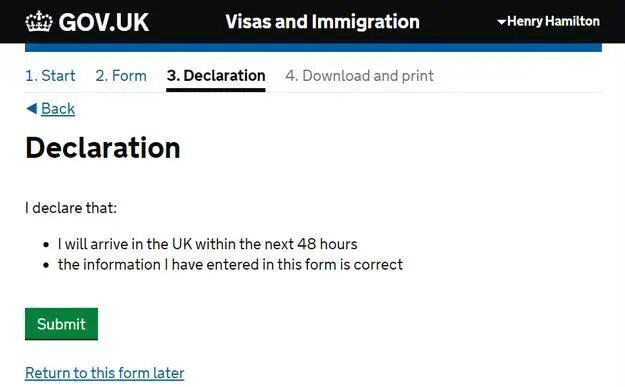 最后一页为申明页,请确认您将在未来48小时内入境,并且刚才填写的所有信息为有效信息,然后提交。