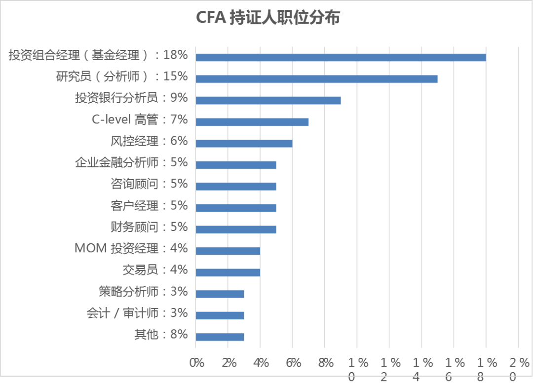 CFA培养高端金融人才,大多从事金融行业优质/核心的工作岗位,50%以上的持证人是投资经理/基金经理/以及企业高管CFO、CEO。