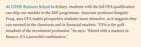 媒体指出:“CFA 使得潜在的商学院学生更具有吸引力,因为该证书表明他们可以同时在学术学习以及金融市场是取得同等成功,CFA 是投资行业的必备黄金标准。”