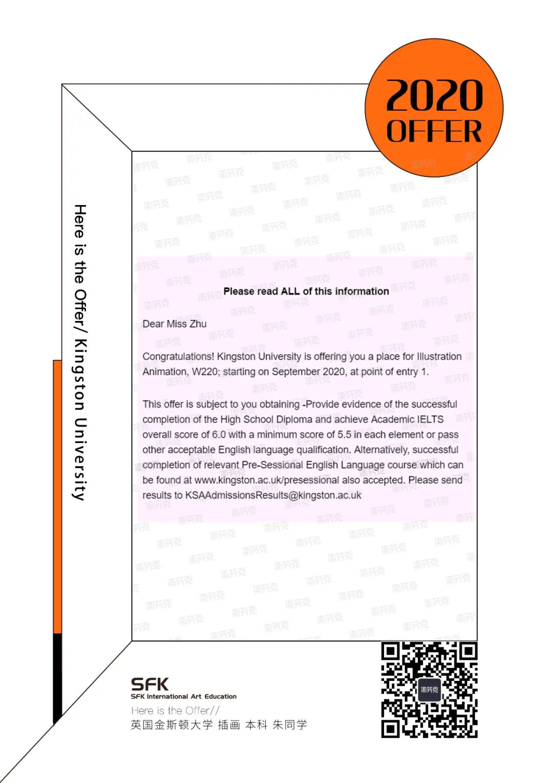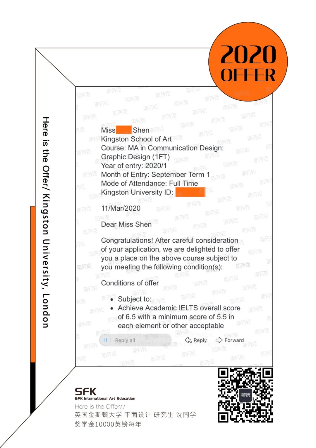 ▲斯芬克学员沈同学,获金斯顿、伦敦大学金史密斯学院、伦艺坎伯韦尔 MA offer,及金斯顿大学每年10000英镑奖学金