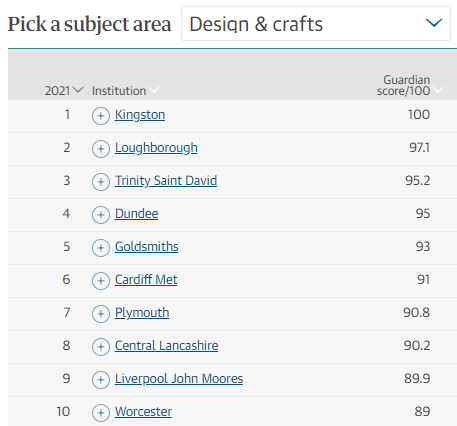 比方说在今年英国卫报排名中,金斯顿综合排名仅仅是英国第40。但当我们选择“艺术与工艺”类(包括平面设计、室内设计、动画设计和家具产品设计四个专业)时,金斯顿却又能排全英第1。