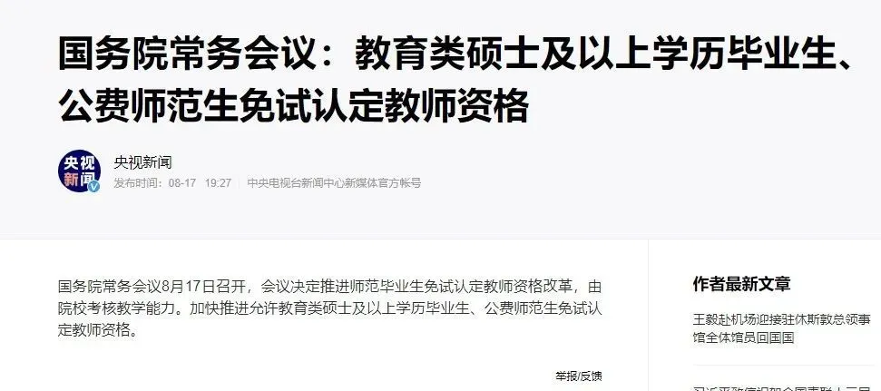 今年8月,国务院常务会议决定推进师范毕业生免试认定教师资格改革,由院校考核教学能力。允许教育类硕士及以上学历毕业生、公费师范生免试认定教师资格。由于教育学专业的硕士和公费师范生的学习内容主要就是与教学相关,因此教师资格证所考核的能力只是一项非常基本的能力。