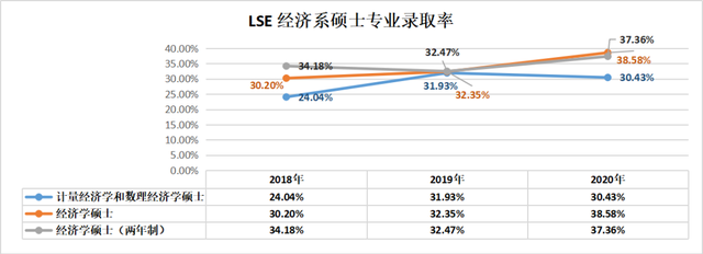 由图可知,最热门专业——经济学硕士的录取比率稳健上升,而其他两个专业的录取率则相对具有不确定性,其中经济学硕士(两年制)经历了先下滑后上升的浮动,而计量经济学和数理经济学硕士则是先上升后回落。整体而言,三个专业的录取率都在24%~38%的范围内,竞争依然较大。