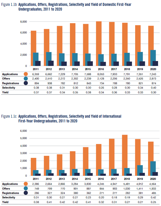 在硕士研究型申请上,国际生的研究型硕士录取率只要6%,比博士的录取率还低,也提醒想申请研究型硕士的学生,要有足够的心理准备。国际生授课型硕士的录取则达到41%,但是最后只有38%的学生选择入读授课型硕士,也可见大家在选择学校上,也并不是非多大不可。