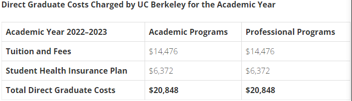 我们最常申的为公立的加州大学系硕士项目,以加州大学伯克利分校(University of California, Berkeley,简称UCB)硕士项目为例,一年的总费用包括学费(国际生需要另缴补充学费)、保险费和生活费。
