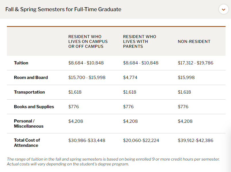以得克萨斯大学奥斯汀分校(University of Texas at Austin简称UT Austin)的硕士项目为例,国际生一年学费约为$20000,总费用约为$42000。