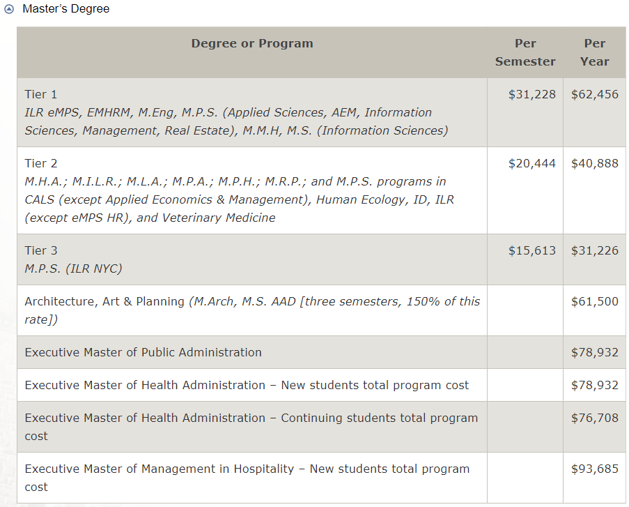 以康奈尔大学(Cornell University,简称Cornell )的硕士项目为例,常申的理工科和文商科硕士项目一年的学费分别约在$31000~$63000之间。★欢迎参与前途出国免费评估,以便给您进行准确定位