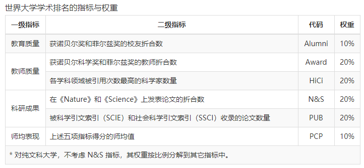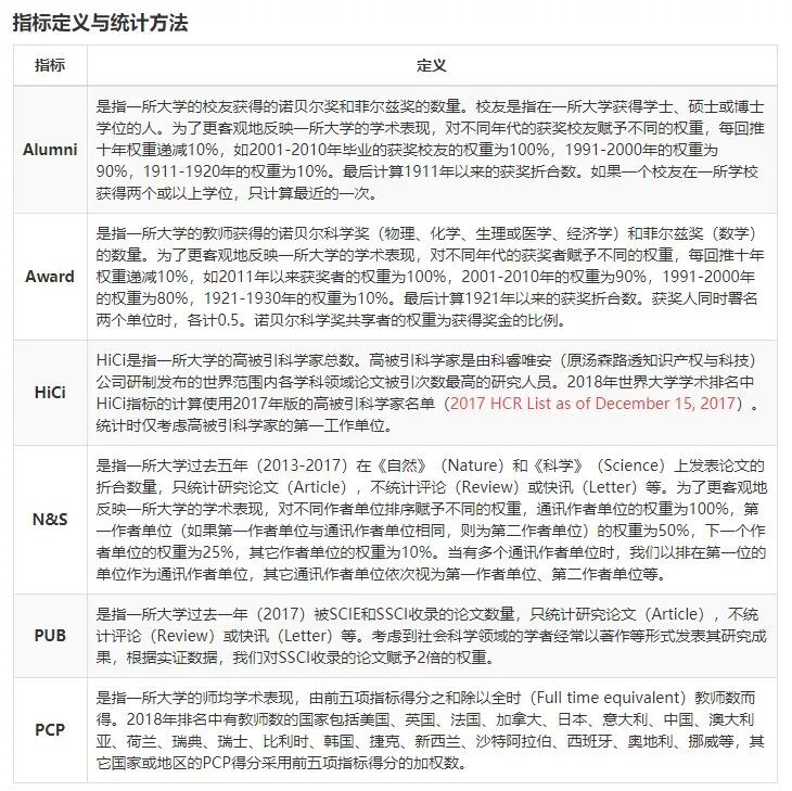 世界大学学术排名选择获诺贝尔奖和菲尔兹奖的校友折合数(简称Alumni)、获诺贝尔奖和菲尔兹奖的教师折合数(简称Award)、各学科领域被引用次数最高的科学家数(简称HiCi)、在《自然》(Nature)和《科学》(Science)上发表论文的折合数(简称N&S)、被科学引文索引(SCIE)和社会科学引文索引(SSCI)收录的论文数(简称PUB)、上述五项指标得分的师均值(简称PCP)等六个指标对世界大学的学术表现进行排名。