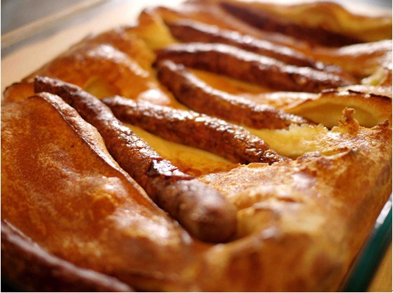 Toad in the Hole,这又是神马东东?往Yorkshire Pudding酥皮上摆香肠烤成的一道菜,中文翻译“洞里的癞蛤蟆”,你说这一道卖相本来就很奇葩的菜怎么还配了这么一道没有食欲的名字呢?真的是暗黑料理啊!!!(─.─|||