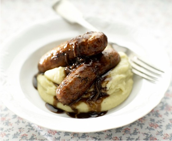 Bangers and Mash,就是香肠配土豆泥,别让名字唬住你,味道不错的,配着洋葱肉汁,很方便做,快捷晚饭。