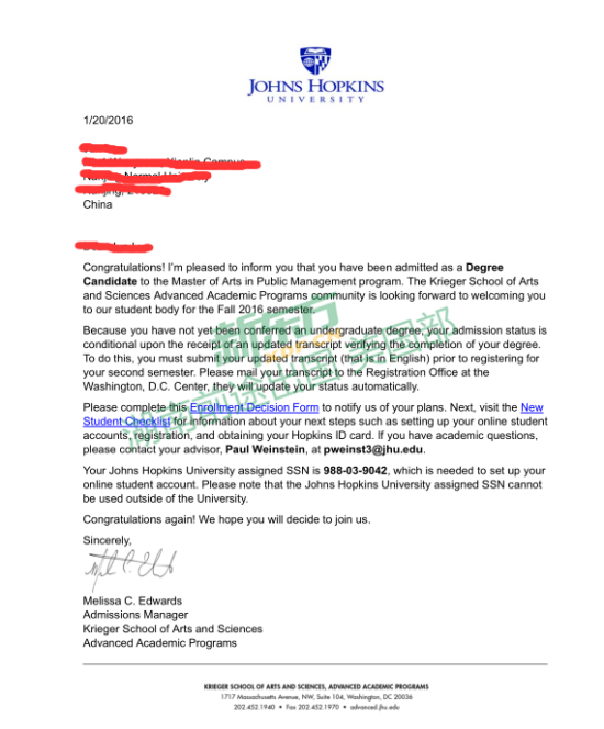 的约翰霍普金斯大学录取,在此,小编恭喜这位同学圆梦美国,在这寒冷的冬季,一枚名校