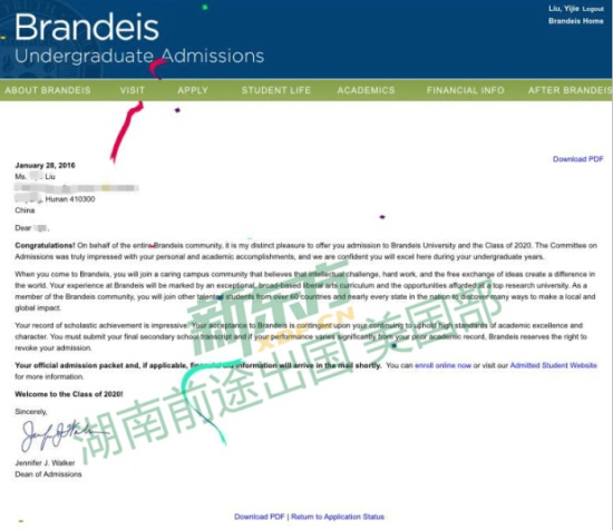 学生在去年10月和11月一直都在忙着刷标化成绩的分数,11月在ADS长沙的前后期专家和ADS外教老师Rowena的共同帮助下,准确帮助学生定位学校,针对申请文书进行解析,积极协助并模拟校友面试,协助跟踪申请后动态,最终获得了学生最心仪的布兰迪斯大学 ED的录取,在此,再次这位同学喜获布兰迪斯大学录取。