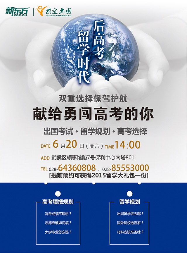 拨打028-64360808电话预约,留下您的姓名和联系方式,凭姓名和联系方式到保利中心南塔801领取留学大礼包一份!