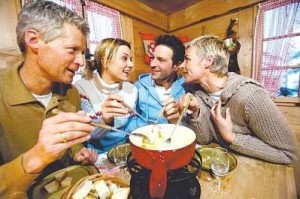 寒冷的冬天,瑞士人的一大乐趣就是全家围坐在一起,吃妈妈制作的奶酪火锅。奶酪火锅国火锅很相似,只不过锅底是溶化了的奶酪,“涮”的菜点是面包、水果、蔬菜。瑞士奶酪火锅的用具非常精美。火锅的材质有金属的,也有陶瓷的。蘸奶酪有专用的叉子。使用这些餐具眼睛也像吃了美味的奶酪一般舒服。