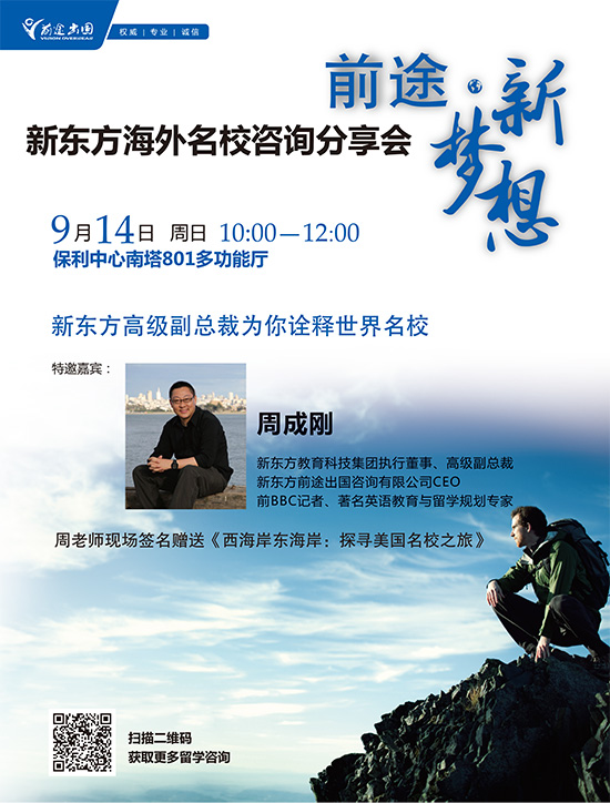 梦想导师、新东方董事兼集团高级副总裁、前途CEO周成刚现场与您分享自身的留学经历和留学理念。