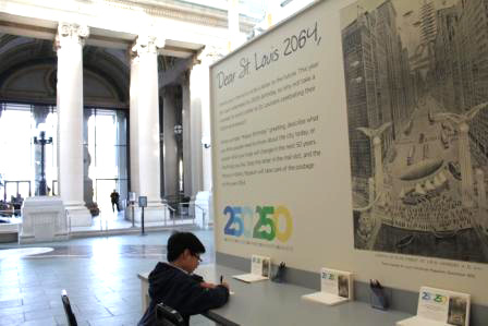 在博物馆大堂, 摆放了很多免费的明信片。这些明信片不是让游客寄回故乡,与家人朋友分享旅行的感受,而是写给50年后,也就是2064年,圣路易斯庆祝300周年时,未来的人们。我们一家人都留了言,以我的年纪,我不知能否等到2064年,但我的儿子一定会再来。我想象着,那时我的儿子也有62岁了, 看到他12岁刚到圣路易斯时写下的给未来的明信片,和他的父母当时的留言,他会有多么百感交集啊!