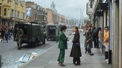 在贝尔法斯特1972年发生炸弹爆炸后,英国军队赶到这里