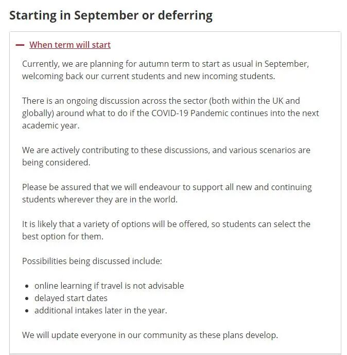 爱丁堡大学官网显示,学校将在新学年正常开放,并表示会在条件允许的情况下,学生可以选择延期入学。
