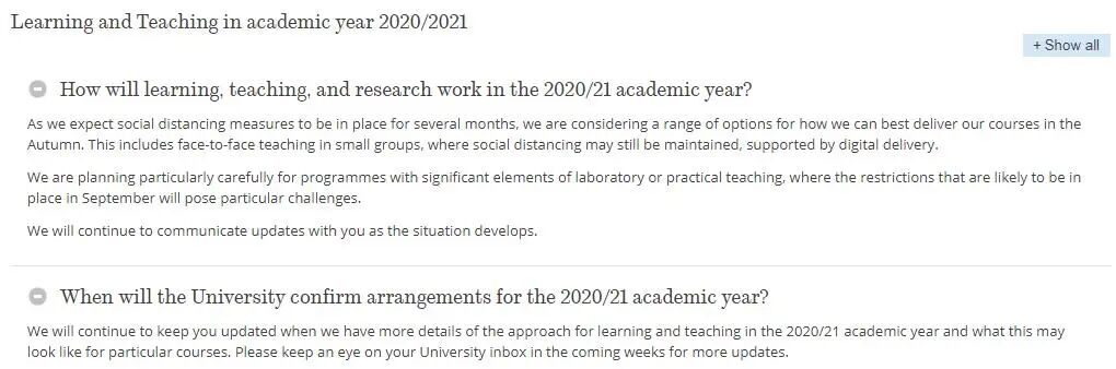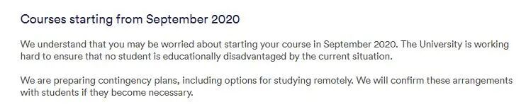 雷丁大学官网表示,计划在秋季学期开始时欢迎学生回到校园,具体授课方式和开学时间还要以政府的指导建议为准。