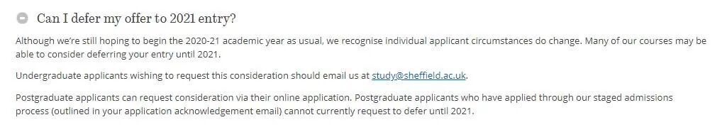 如果学生无法返回校园,也可以推迟到2021年9月入学。但延期入学只能申请一次,且时长不能超过一学年。