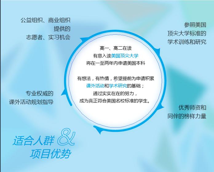 志领计划应运而生,针对希望提升自身综合素质,提前一年或两年为美国大学申请做好全方位准备的高中生。通过三大模块:美国名校申请提前规划,比照名校标准的学术指导,课外活动实战演练,增强学生在申请中的竞争力。
