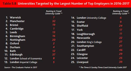 2016-17年度,最受英国顶尖企业青睐的是华威大学的毕业生,其次是曼彻斯特大学和布里斯托大学。