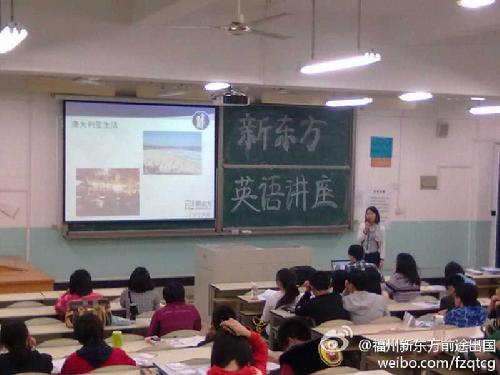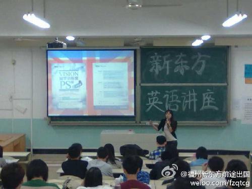2012年11月14日,福州新东方前途出国高校公益讲座首次走进福建农林大学。本活动由新东方前途出国咨询公司主办旨在为具有出国的需求的同学提供具有价值的出国信息。活动过程中,新东方前途出国英国部主管游琳艳老师,新东方前途出国澳新部资深顾问刘晓西老师,以及国外考试部雅思专家刘畅老师分别为学生介绍了英澳及雅思考试的相关讯息,游琳艳老师的妙语连珠更是调动了同学的极大热情。据悉,未来几周,福州新东方前途出国还将在福州各大高校展开有关出国规划的公益讲座。希望可以为更多的榕城学子实现出国梦想。