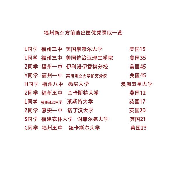 你们好!时值年关,经过一年的不懈努力,福州新东方前途出国在名校录取上取得了不俗的成绩,截止目前共有10名同学收到了来自美国,澳洲,英国顶尖学校的录取,而我们的优秀成绩还在继续。在这里,首先,我们需要感这位学生及家长对我们的信任,没有你们的积极配合努力,是很难取得这些成绩的。其次,要感谢每位顾问老师专业的态度及忘我的职业素养,我们知道从选择学校,到材料准备,到文书写作,每一个看似简单的环节都凝聚了老师们的心血,福州新东方前途出国的老师对于每一个细节的认真把握便是对是对学生家长的圆梦最大保障。新的一年,我们将更加努力,希望可以帮助更多的家长及孩子圆出国留学的梦想!