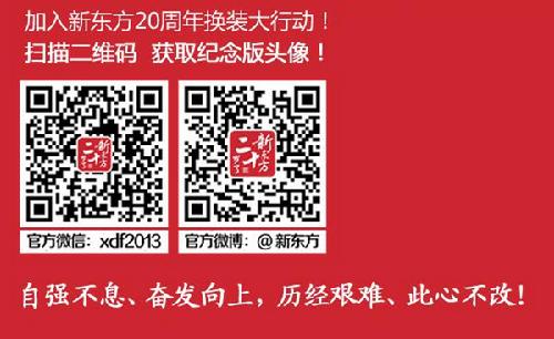 20岁的新东方将再次起航!未来的道路还很长,因为我们怀抱着百年教育的梦想;未来的时间又很紧,因为我们肩负着教育报国的重任。请相信新东方人,我们不会放弃,我们更不会退缩,在未来的20年,新东方将会以更加成熟的姿态,为中国和世界的教育事业添砖加瓦,贡献自己的全部智慧和力量。