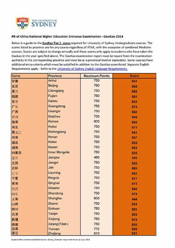 悉尼大学公布了对于今年高考生的本科直录分数线,请大家参考.