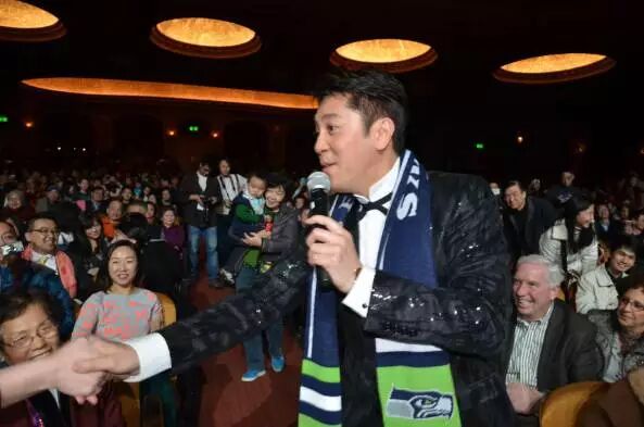 他继续往剧场的中间和后面走去。观众席里面有人把一条西雅图橄榄球队12人的围巾披在了他的脖子上。他兴奋地挥着围巾,说非常喜欢这份礼物,这是友谊的见证,并且用英语说“Thank you Seattle。”